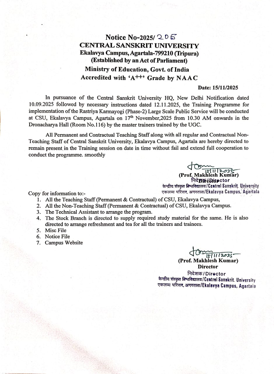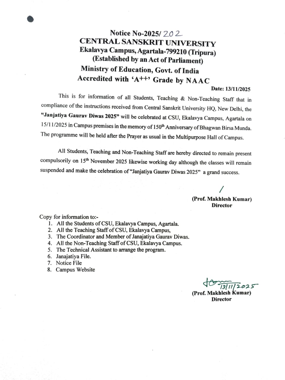 Central Sanskrit University is purely a Central University. It has a total number of 13 campuses all over India. Central Sanskrit University, Ekalavya Campus, Agartala, is one of the 13 campuses of this University. It is situated at Lembucherra, Tripura. This Campus started functioning here on 04-06-2013 onwards. It offers academic programmes like Prakshastri, Shastri, Shiksha Shastra, Acharya & Vidya Varidhi. This Campus is comprised of eight (08) departments as following –