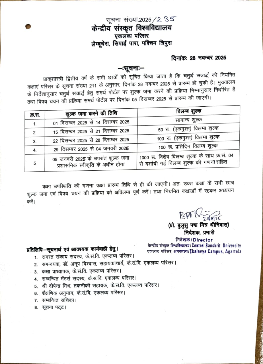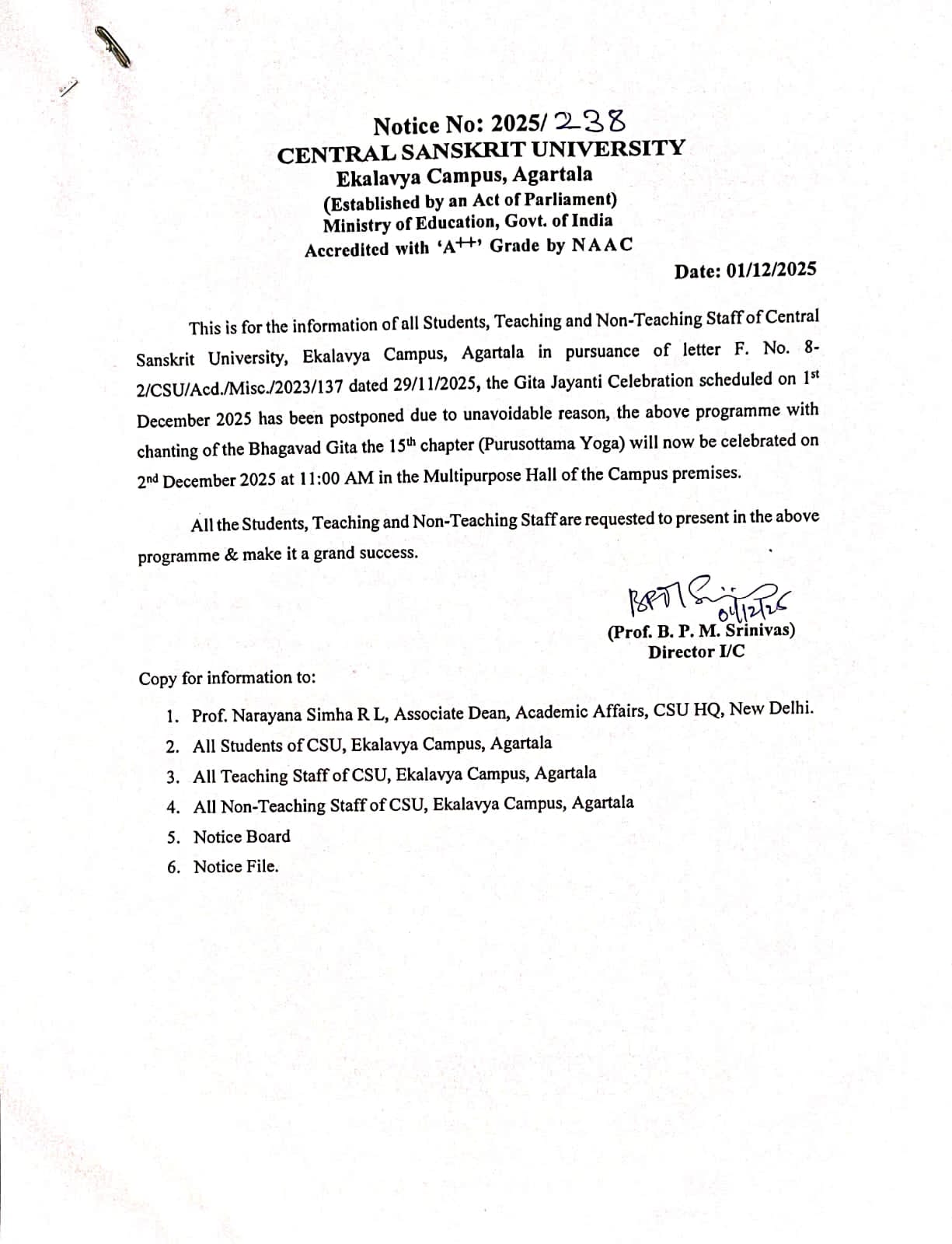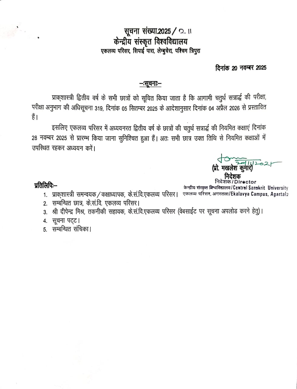 Central Sanskrit University is purely a Central University. It has a total number of 13 campuses all over India. Central Sanskrit University, Ekalavya Campus, Agartala, is one of the 13 campuses of this University. It is situated at Lembucherra, Tripura. This Campus started functioning here on 04-06-2013 onwards. It offers academic programmes like Prakshastri, Shastri, Shiksha Shastra, Acharya & Vidya Varidhi. This Campus is comprised of eight (08) departments as following –