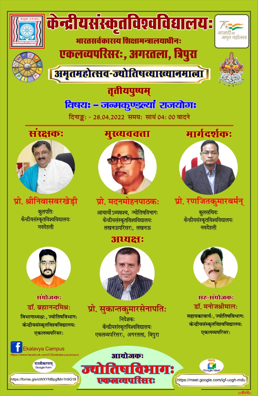 सविनयं भवन्तस्सूच्यन्ते यत् केन्द्रीयसंस्कृतविश्वविद्यालयस्य एकलव्यपरिसरस्य ज्योतिषविभागेन अमृतमहोत्सवमुपलक्ष्य ज्योतिषव्याख्यानमालाया: आयोजनं क्रियते। अस्या: व्याख्यानमालाया: तृतीयव्याख्यानम् २८/०४/२०२२ तमे दिनाङ्के अपराह्णे ४:०० वादने "जन्मकुण्डल्यां राजयोगः" इति विषये समायोज्यते। तत्र भवतां समेषां सुरभारतीसमुपासकानां सादरमुपस्थितिं कामयामहे। धन्यवाद:।