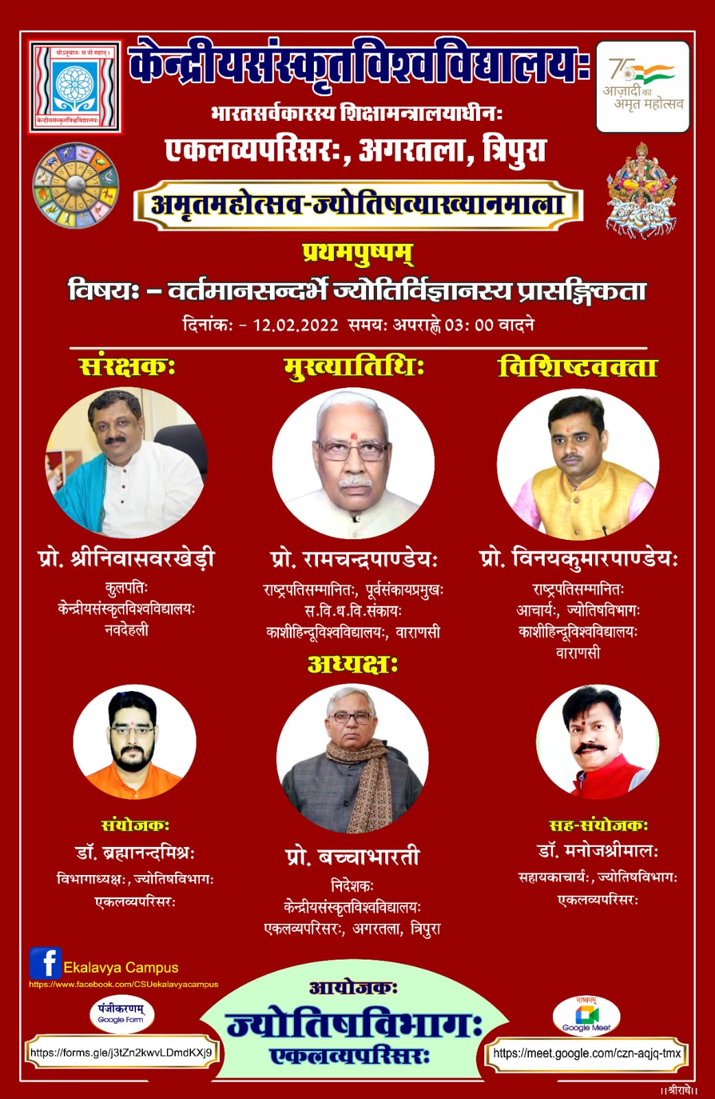 सविनयं भवन्तस्सूच्यन्ते यत् केन्द्रीयसंस्कृतविश्वविद्यालयस्य एकलव्यपरिसरस्य ज्योतिषविभागेन अमृतमहोत्सवमुपलक्ष्य ज्योतिषव्याख्यानमालाया: आयोजनं क्रियते। अस्या: व्याख्यानमालाया: प्रथमव्याख्यानम् १२/०२/२०२२ तमे दिनाङ्के अपराह्णे ३:०० वादने "वर्त्तमानसन्दर्भे ज्योतिर्विज्ञानस्य प्रासङ्गिकता" इति विषये समायोज्यते। तत्र भवतां समेषां सादरमुपस्थितिं कामयामहे। धन्यवाद:।