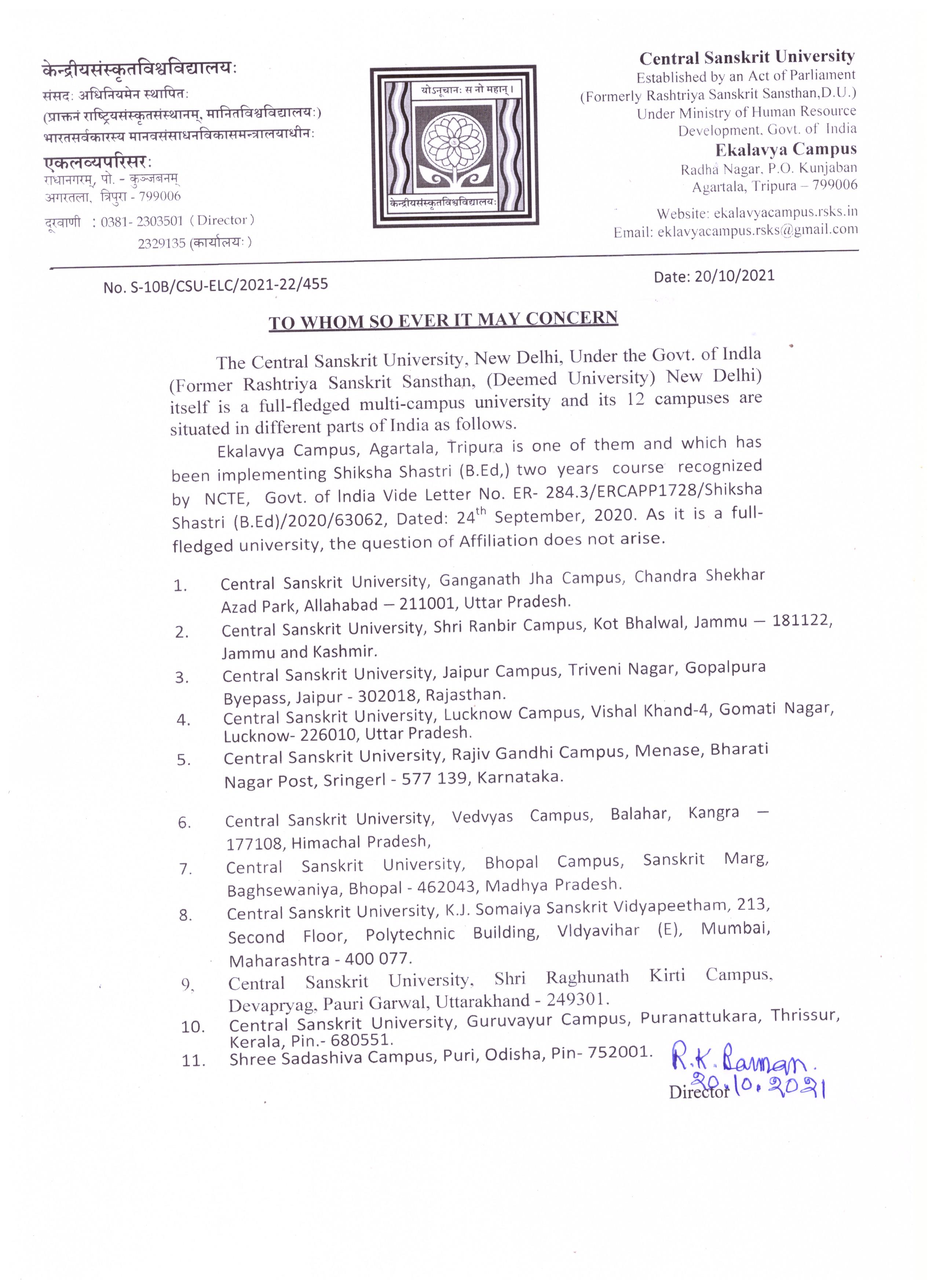 प्राक्शास्त्रिप्रवेशावेदनपत्रम् ,के.सं.विश्वविद्यालयः, एकलव्यपरिसरः, अगरतला